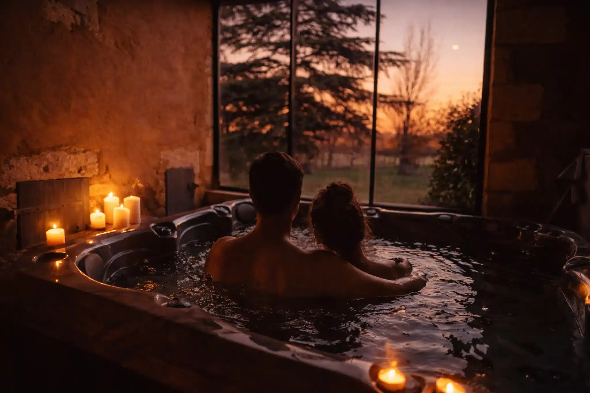 L’eau chaude vous enveloppe et masse le corps en douceur. Les tensions s’effacent, la respiration ralentit, le temps semble suspendu.